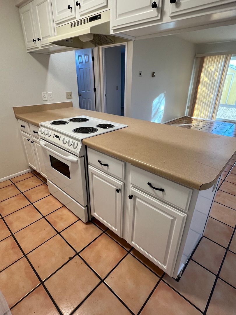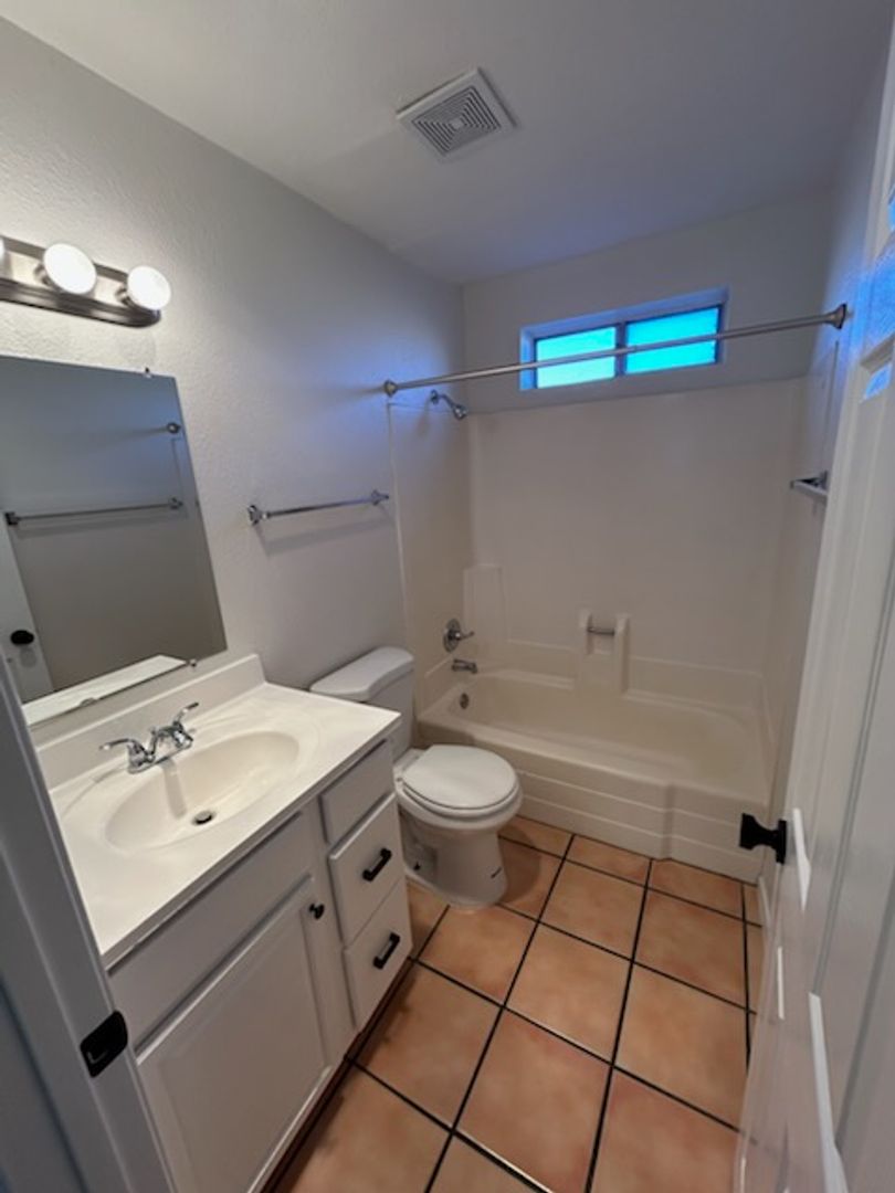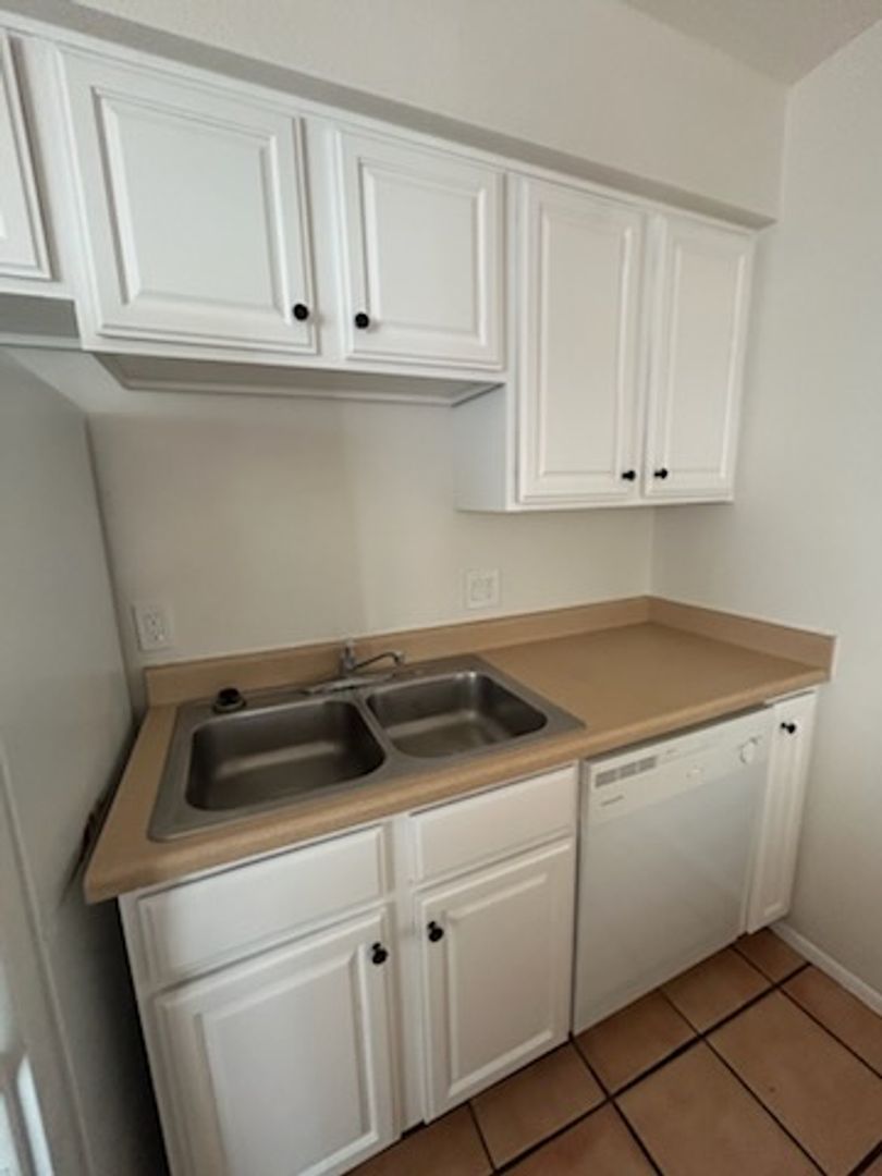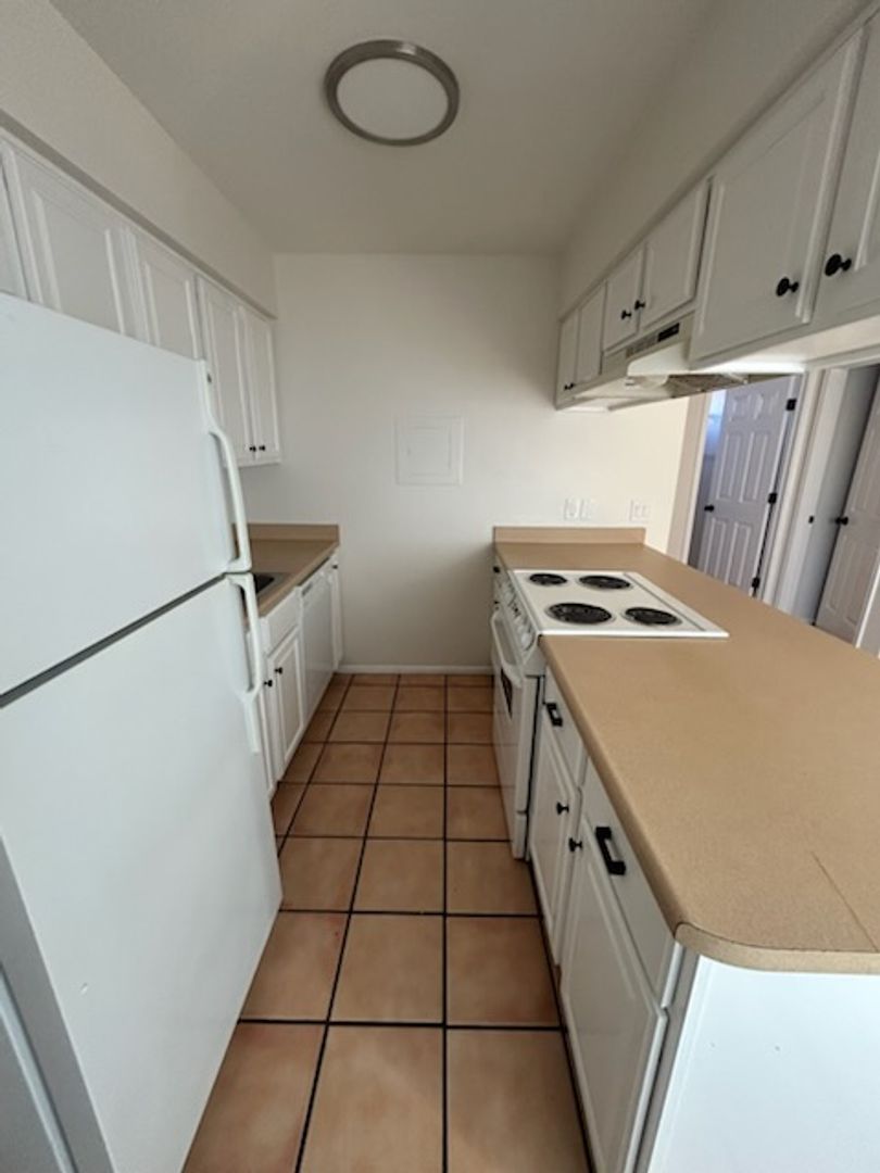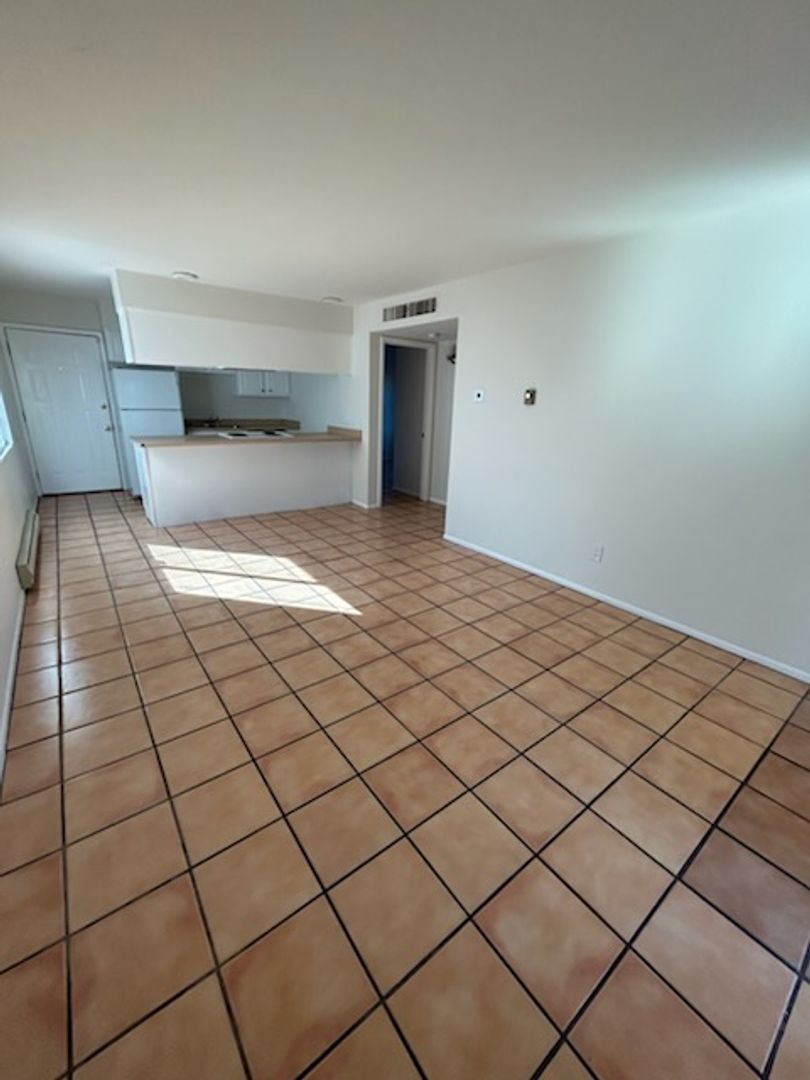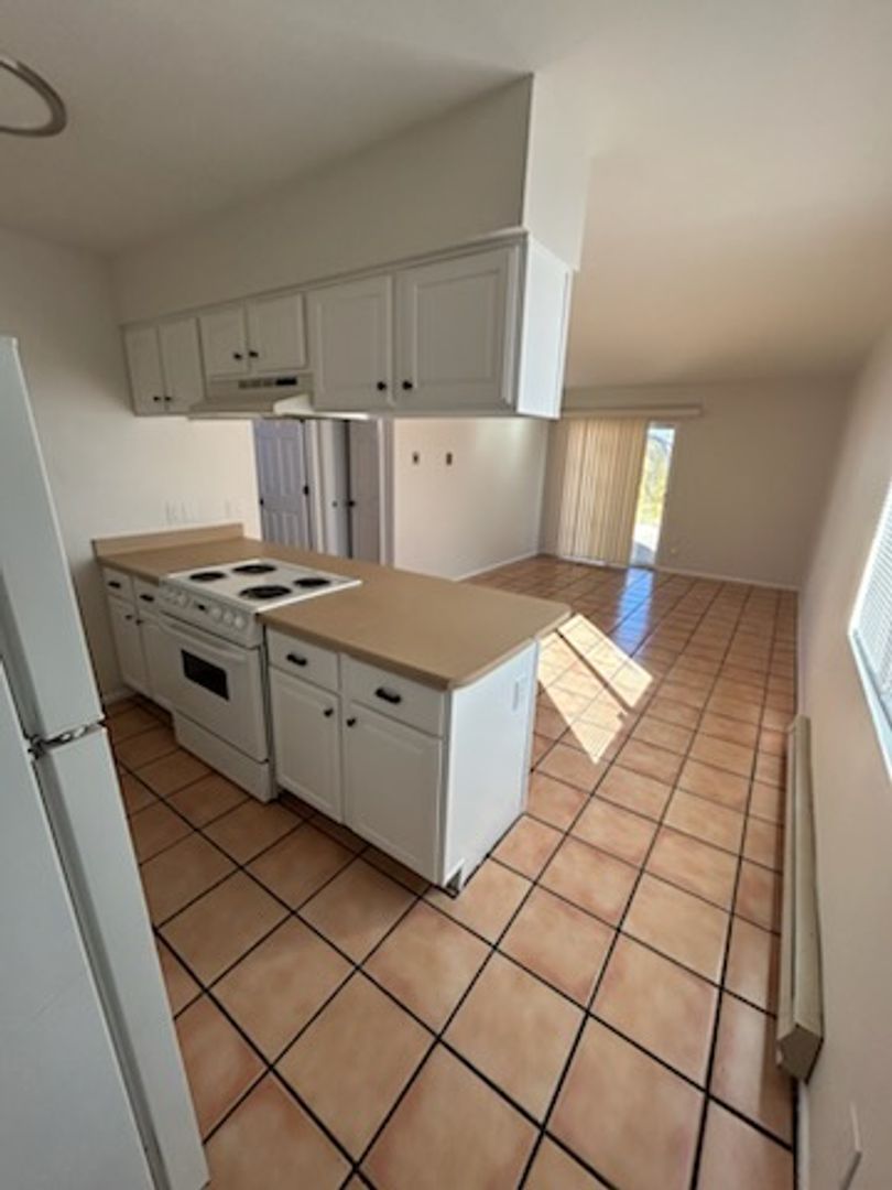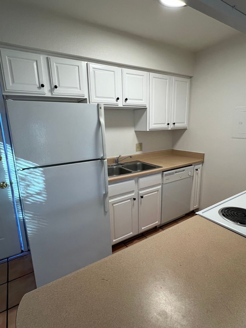 2 bedroom 1 bath - 1st floor unit. Compete with fridge and stove. Convenient bar seating at kitchen. Saultillo tile thoughout. Freshly painted (cabinets are now white). Tub / shower combo. HUGE yard with storgage shed!